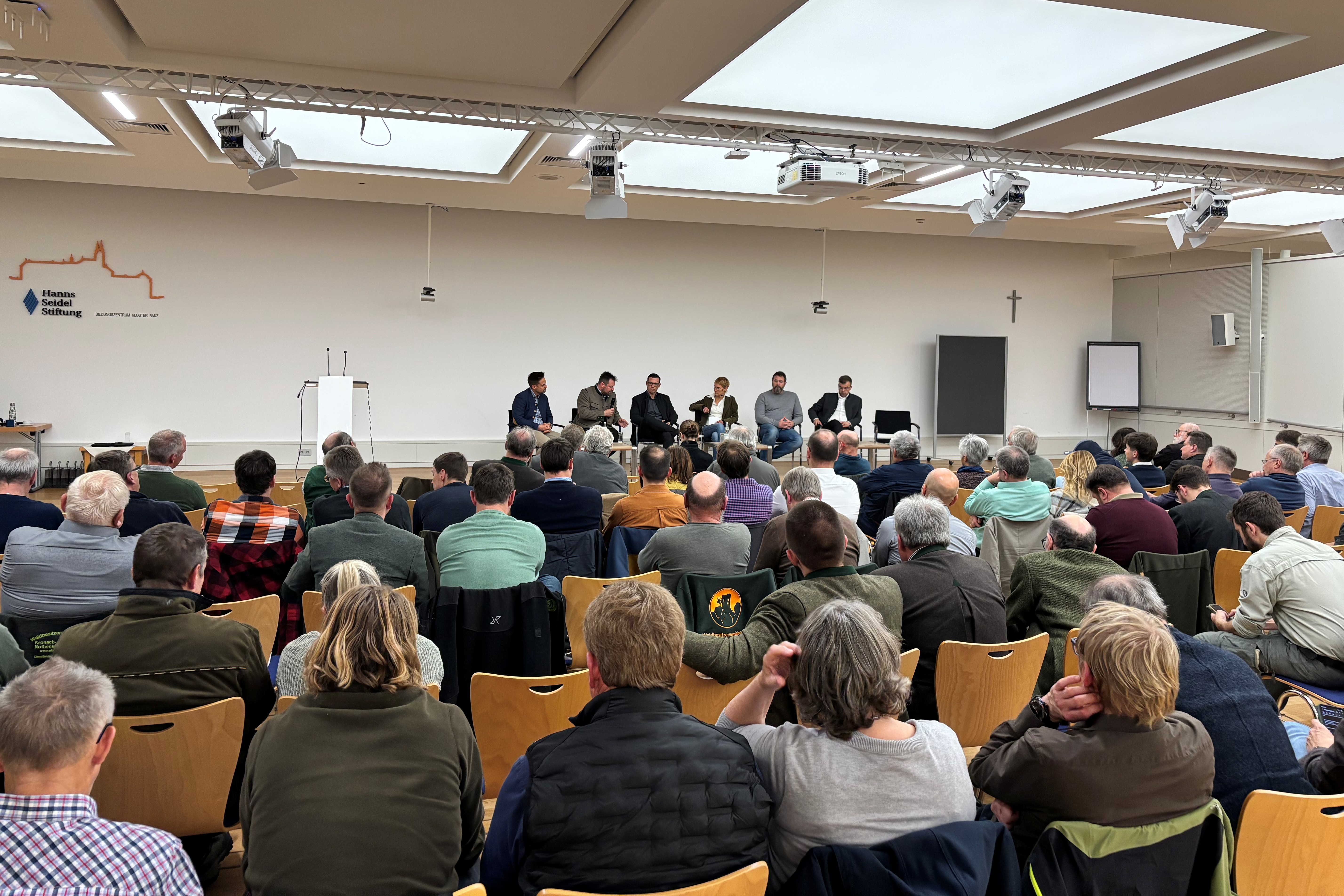 Rund 100 Interessierte kamen Ende Oktober zur zweiten „Diskussion auf Banz“ der Forstwirtschaftlichen Vereinigung Oberfranken. Sie sprachen im Rahmen einer Podiumsdiskussion mit Bernhard Breitsameter, Präsident des Bayerischen Waldbesitzerverbands und weiteren hochkarätigen Experten der Forst- und Holzbranche über die Zukunft des Frankenwaldes. Moderiert wurde die Veranstaltung von Kirstin Zesewitz vom Bayerischen Rundfunk.